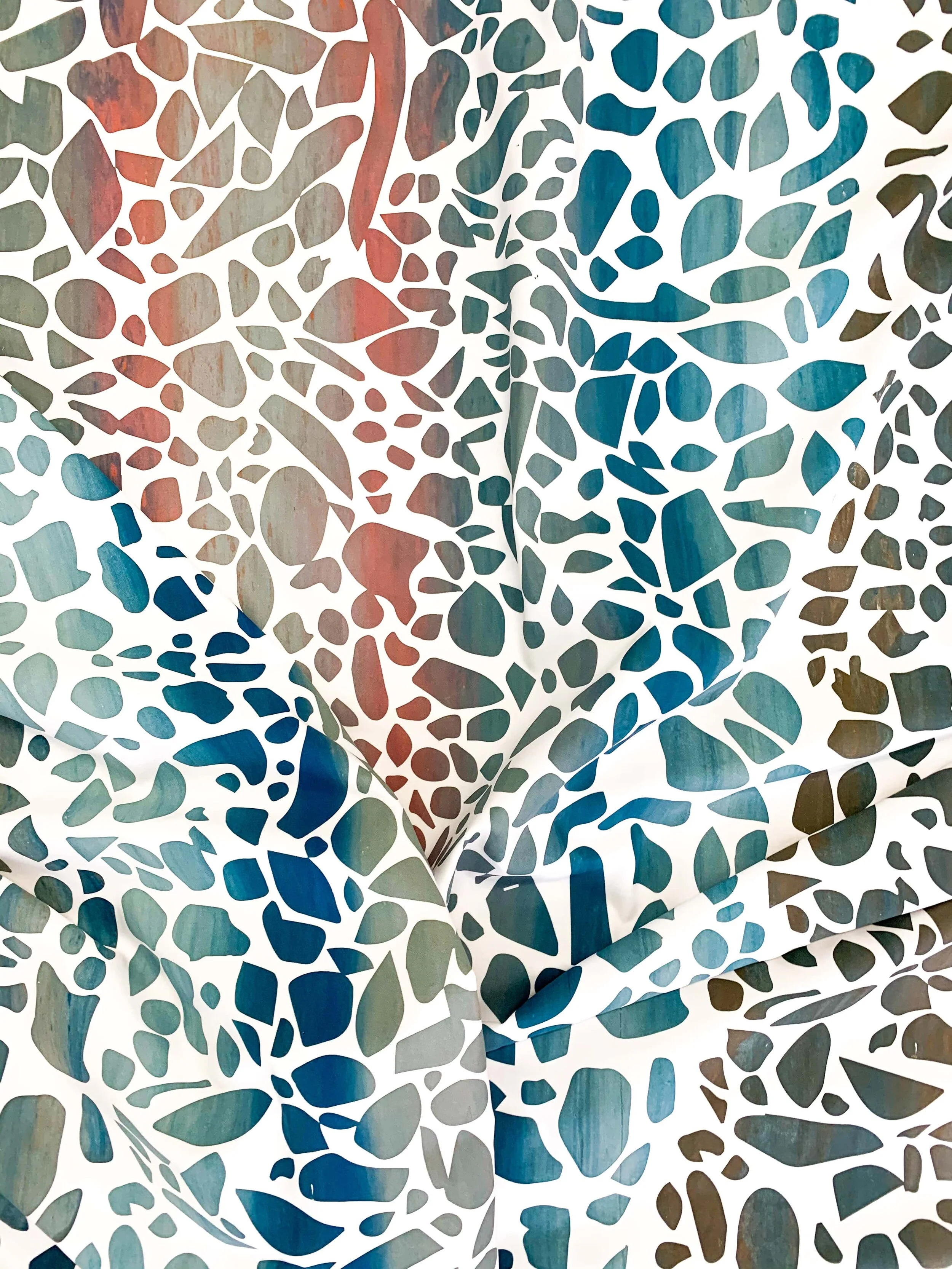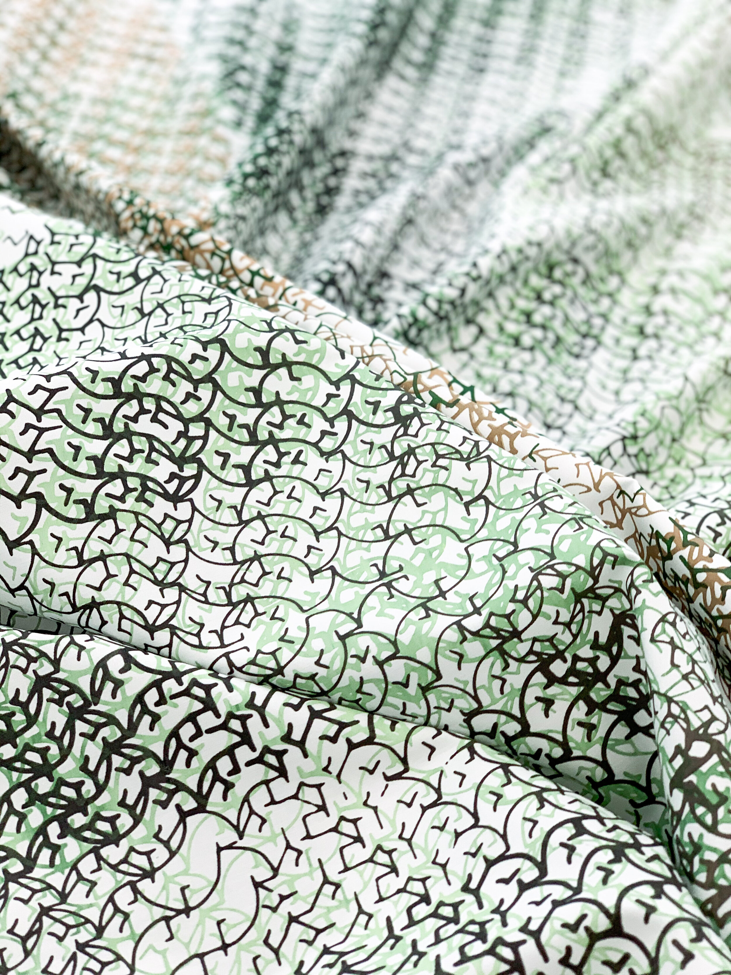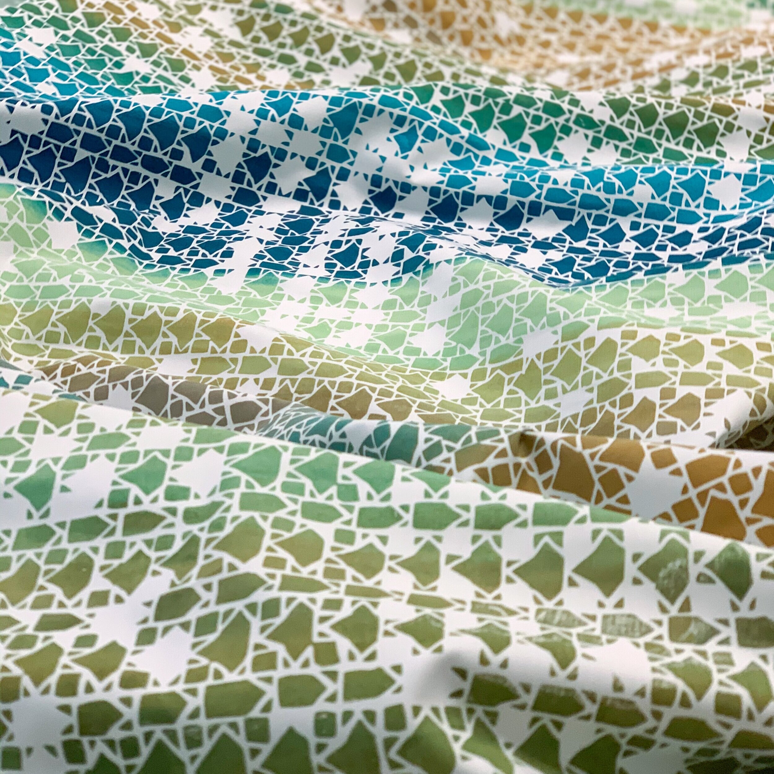 Multi Layer: Ein wildes willkürliches Überlagern des Designs in verschiedenen Farbnuancen und Farbverläufen die auch direkt, während dem Druckprozess am Sieb gemischt werden, damit einen optischer Moiré-Effekt entsteht und somit jeder Laufmeter ein Unikat und besonders individuell ist.
