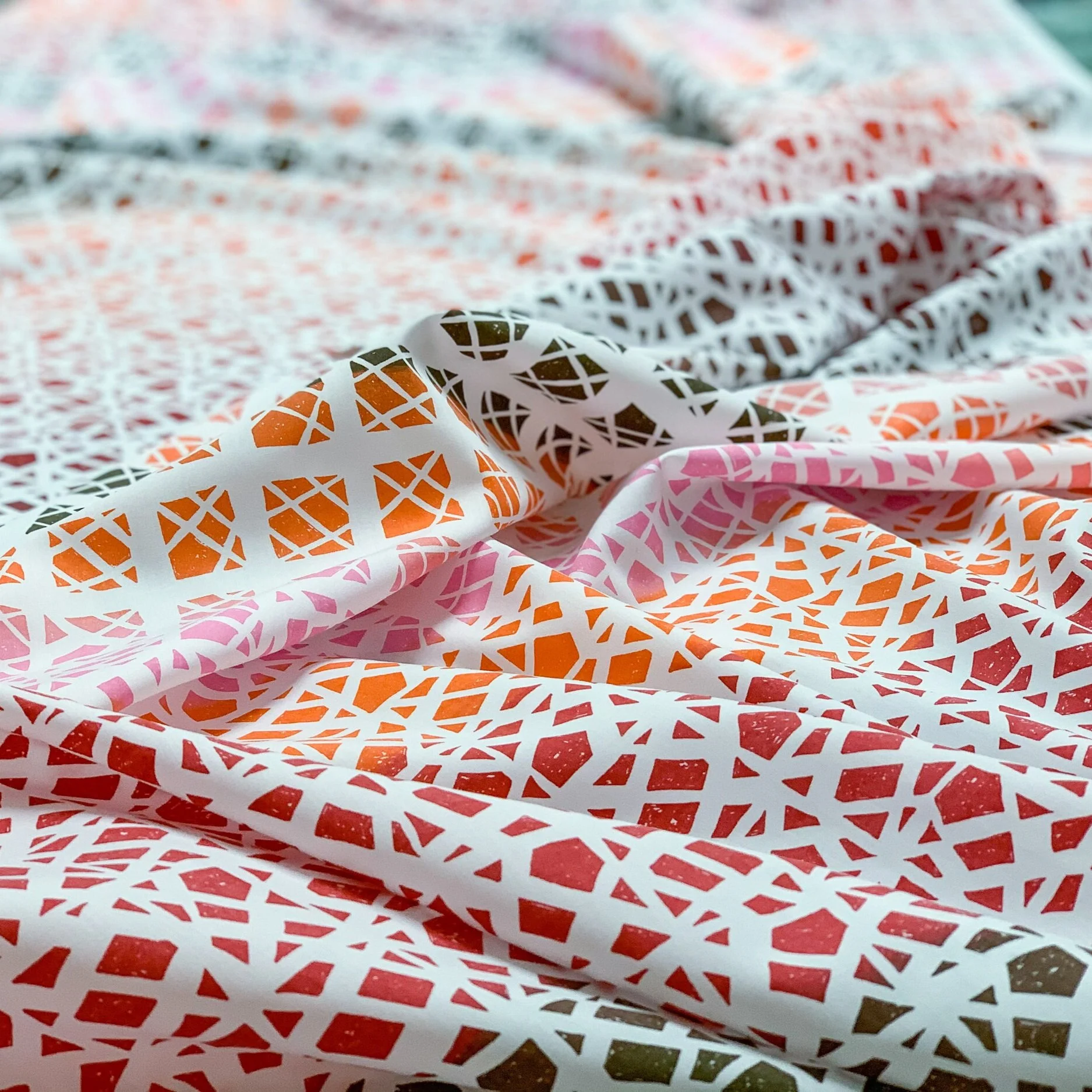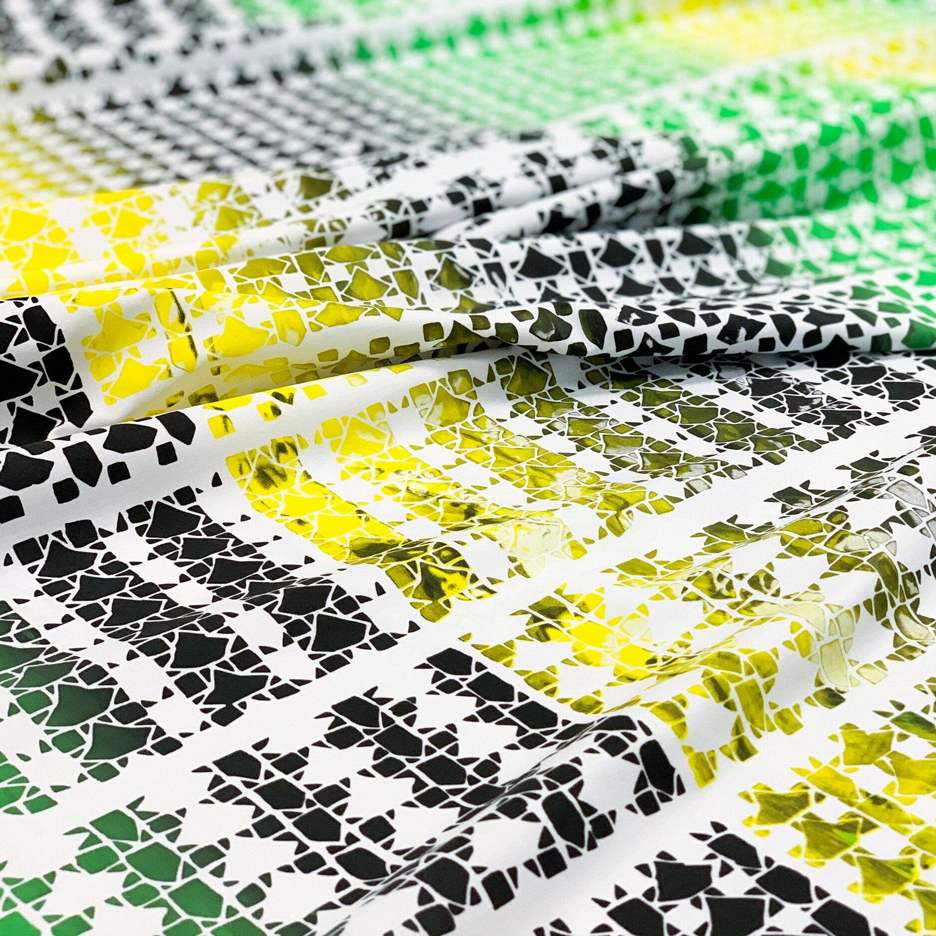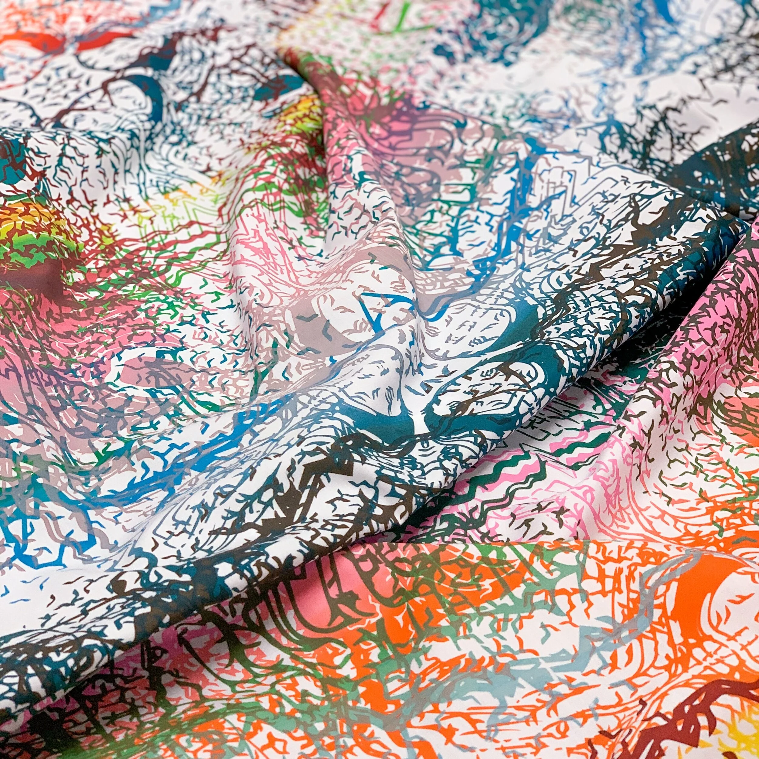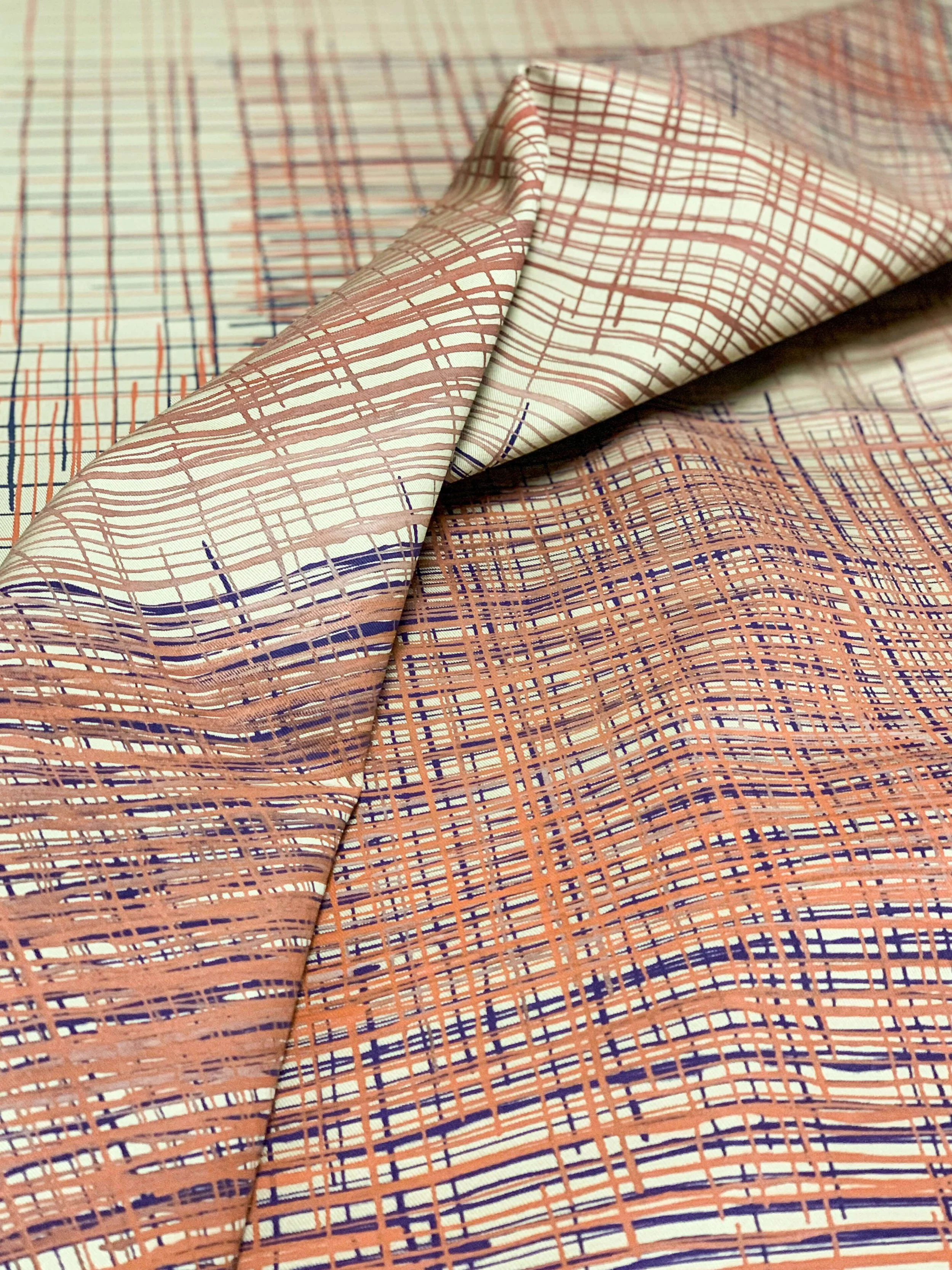 Multi Layer: Ein wildes willkürliches Überlagern des Designs in verschiedenen Farbnuancen und Farbverläufen die auch direkt, während dem Druckprozess am Sieb gemischt werden, damit einen optischer Moiré-Effekt entsteht und somit jeder Laufmeter ein Unikat und besonders individuell ist.